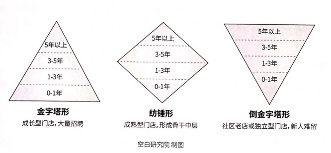 人员结构并非是一成不变的。从从业年限来看,对于新成立的门店,新人占比往往较多,店长需要花费更多的精力在招聘和培训上;对于5年以上的老店或主张精英作战的门店而言,主要以3年以上的经验者为主,新人只占少数,这样的门店侧重于管理和运营。