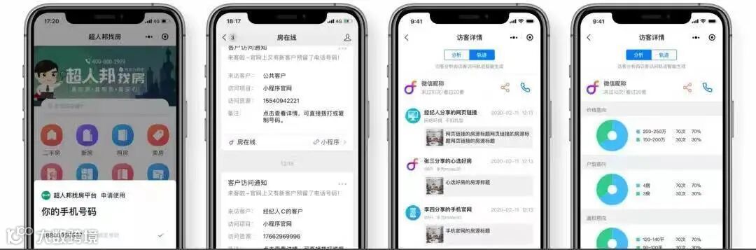 将小程序分享到微信群、带有专属二维码的房源海报发给客户,发布九宫格、分享房源链接到朋友圈等等,客户只要点击,系统后台就能获取到客户电话和浏览轨迹,立马将微信的公共客户变成私有客户,秒速增长客源,盘活微信沉睡用户。