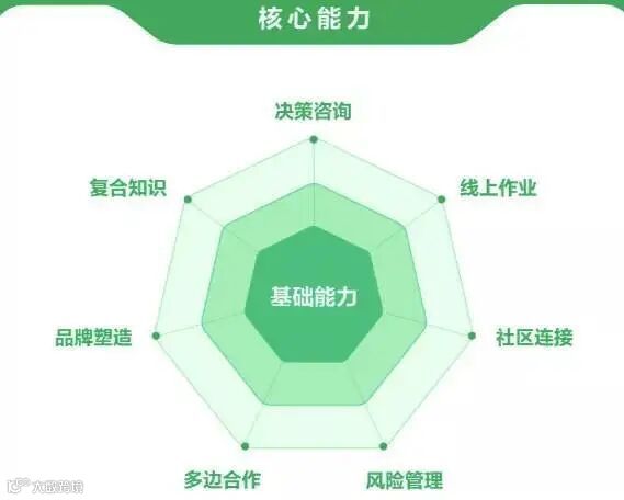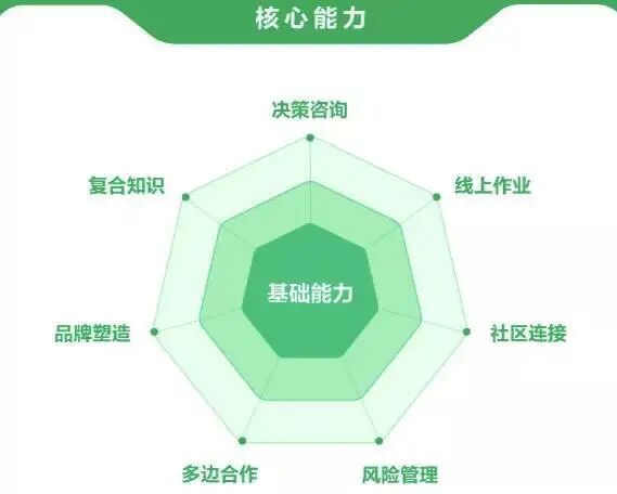 当然,多元职能还有其他,比如像识别和规避交易流程中的现在风险——风险管理;房源的维护和管理,提升信息呈现质量,用线上化工具提高服务——线上专家等,这些多元的职能被整合定义为以下的7种核心能力:决策咨询、线上作业、社区链接、风险管理、多边合作、品牌塑造、复合知识。