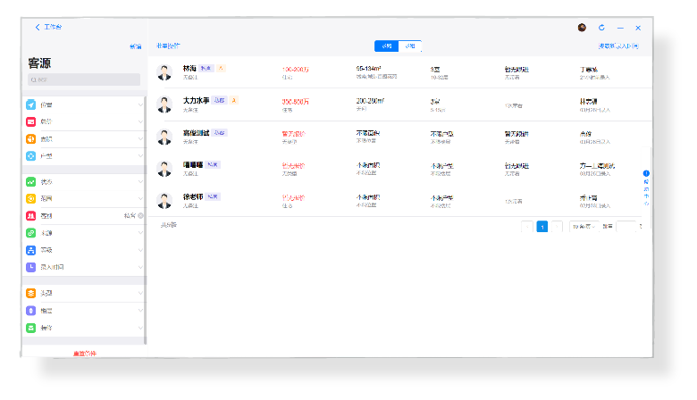 客源信息管理是所有房产中介SaaS系统的重要功能模块,主要有客源详情、客源操作、客源筛选等部分,能够使客源信息(包括客源等级、客别(公客/私客)、联系方式、需求意向等)的管理及呈现达到完整有效、格式一致,便于经纪人了解客户,跟进客户。