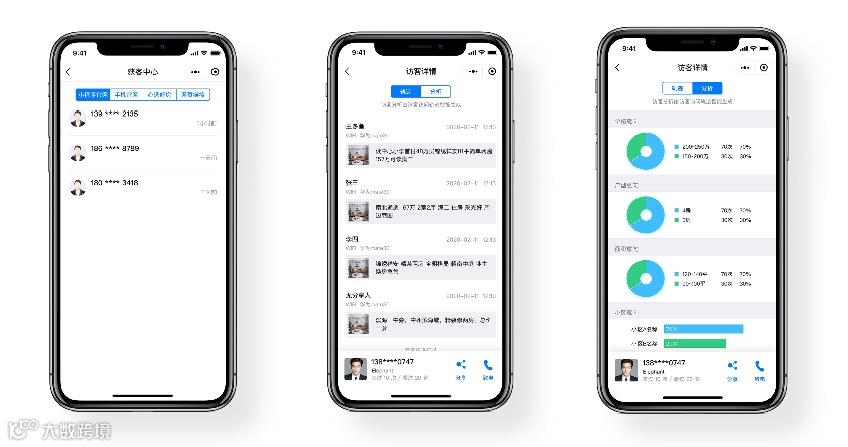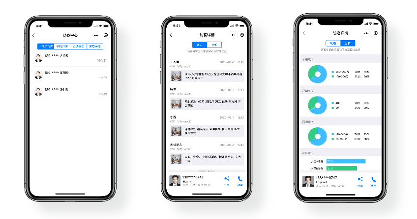 依靠着系统内的增值服务功能“获客官网”中的微信小程序端,房产中介不论是线下发单、橱窗广告,还是线上朋友圈、微信群、附近小程序获客,都能自动获取到客户电话号码,及时了解到客户的购房意向,及时跟进,增加客户转化几率。