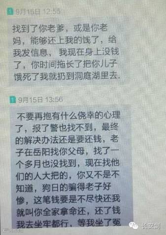 12时55分,一条威胁短信揪住了小智母亲的心:“能还上我的钱了,给我发信息,时间拖长了,把你儿子饿死了,我就扔到洞庭湖里去。”