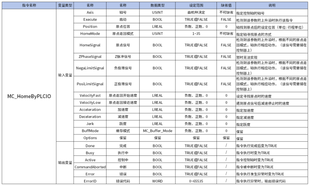 【说明】MC_HomeByPLCIO指令与前两个指令执行动作基本一致,但是原点及限位信号是接到控制器里面的,伺服电机的回原动作是控制器控制的,只有在寻到原点位置后才会触发伺服的35号回原方式(以当前位置为原点)。