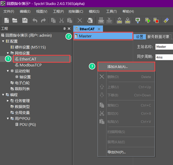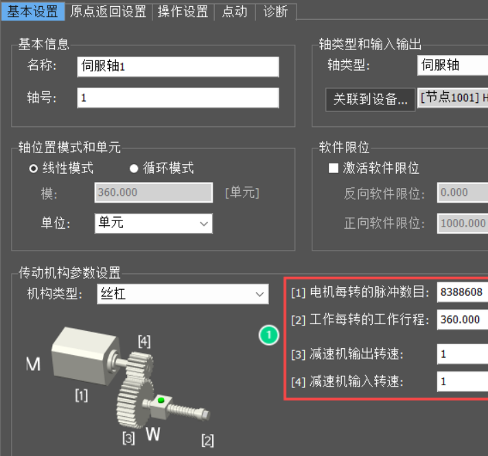 【添加从站】>>【添加伺服轴】>>【关联设备】>>【机构参数设置】