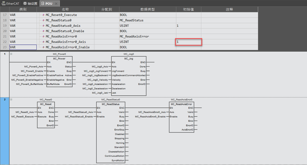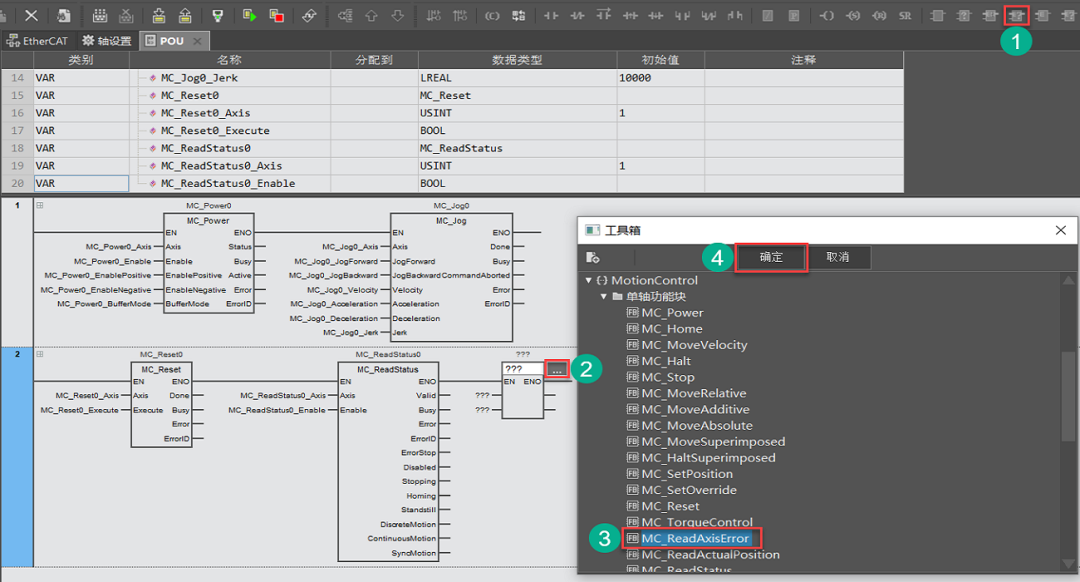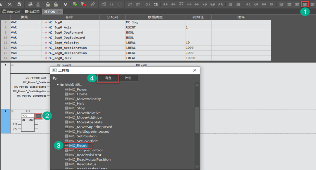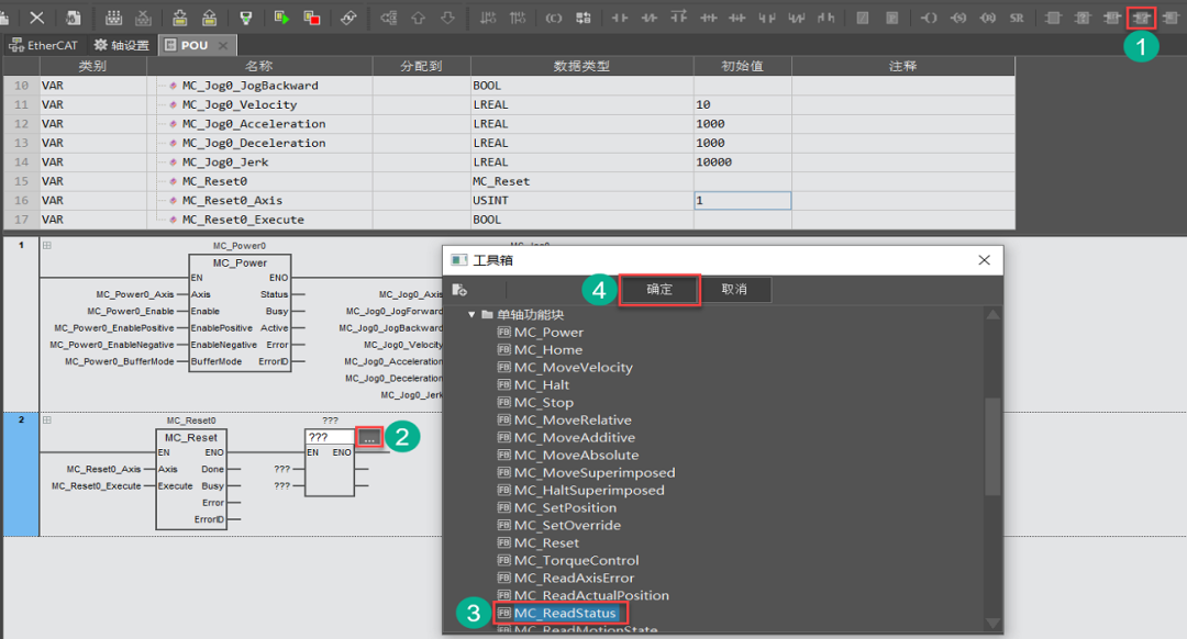 ⑥进行MC_Reset、MC_ReadStatus、MC_ReadAxisError功能块测试(以下为连续步骤)