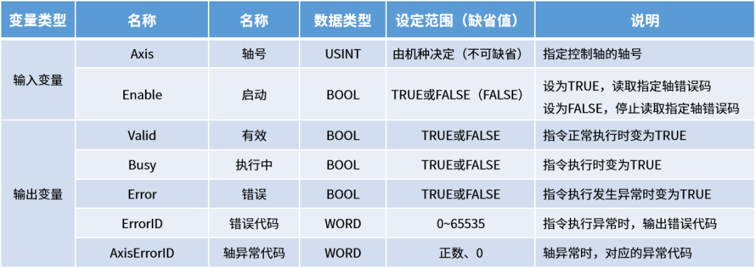 复位处于ErrorStop状态的轴,包括复位该轴的轴状态和复位对应伺服驱动器的报警状态(需参照伺服手册报警说明)。