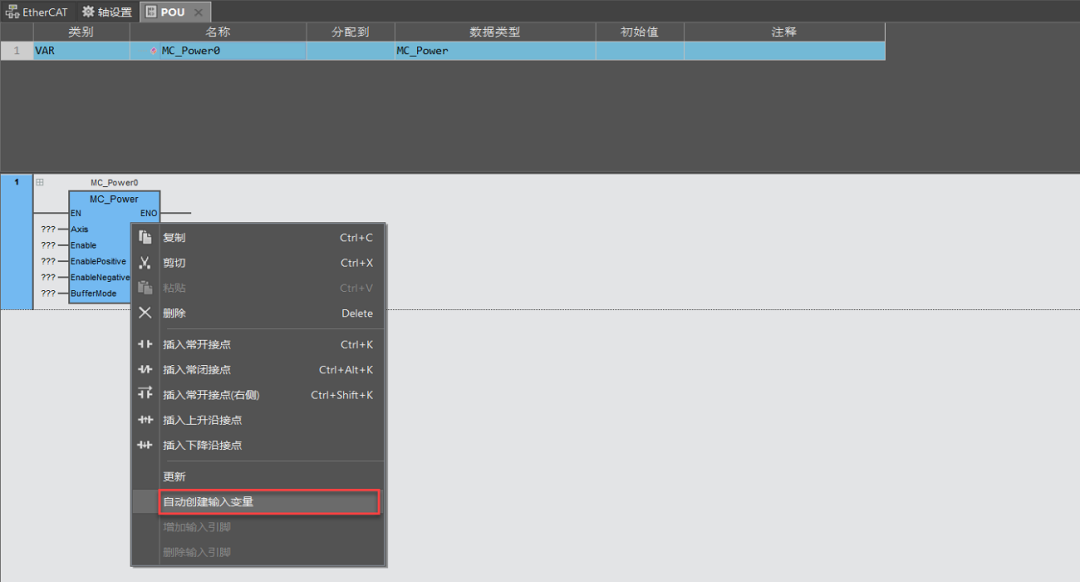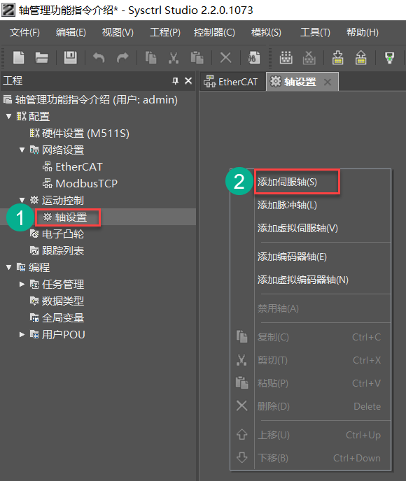 点开【运动控制】>> 【轴设置】>> 空白处右击【添加伺服轴】