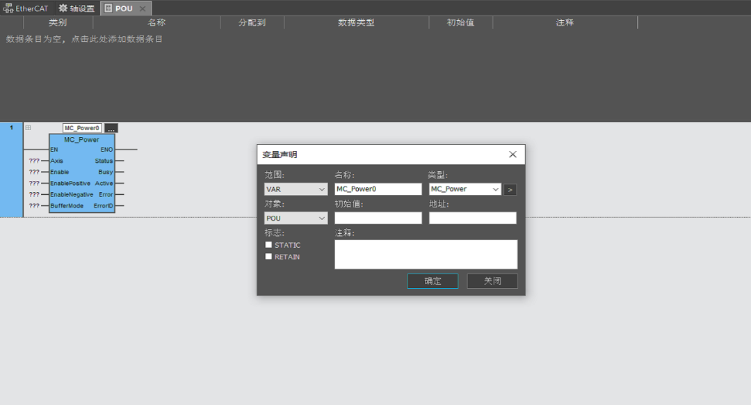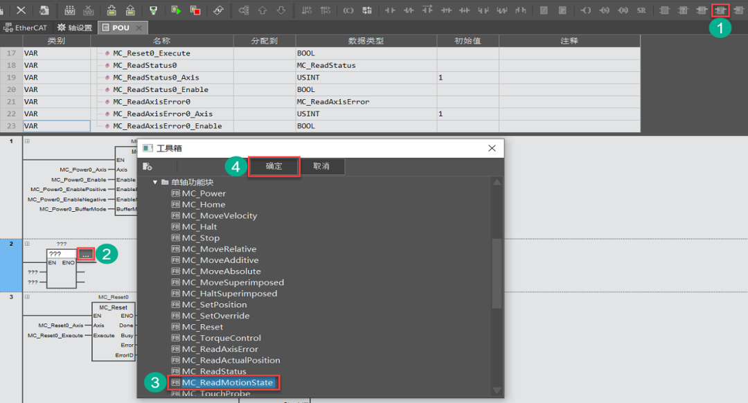 ②进行MC_ReadMotionState功能块测试(以下为连续步骤)