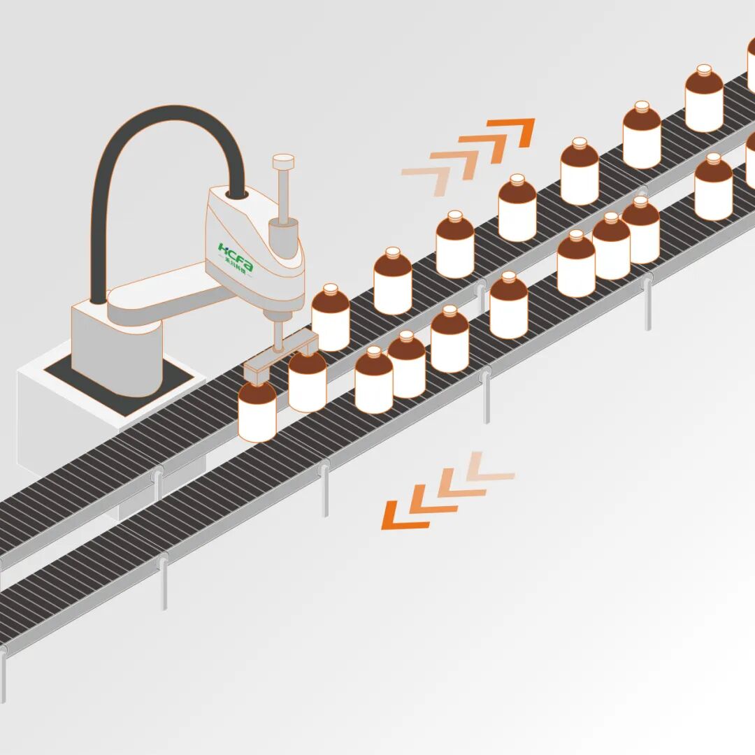 酒瓶标签缺陷检测设备用于各种大小的白酒空瓶标签残缺检测,在整条生产线中SCARA机器人充当了搬运工的角色。对输入线传送带上随机传输过来的酒瓶触发外部传感器信号,机器人读取对应输送线轴位置后,依次抓取两个酒瓶,摆放到输出线传送带上,每两个酒瓶之间的距离要求相等。