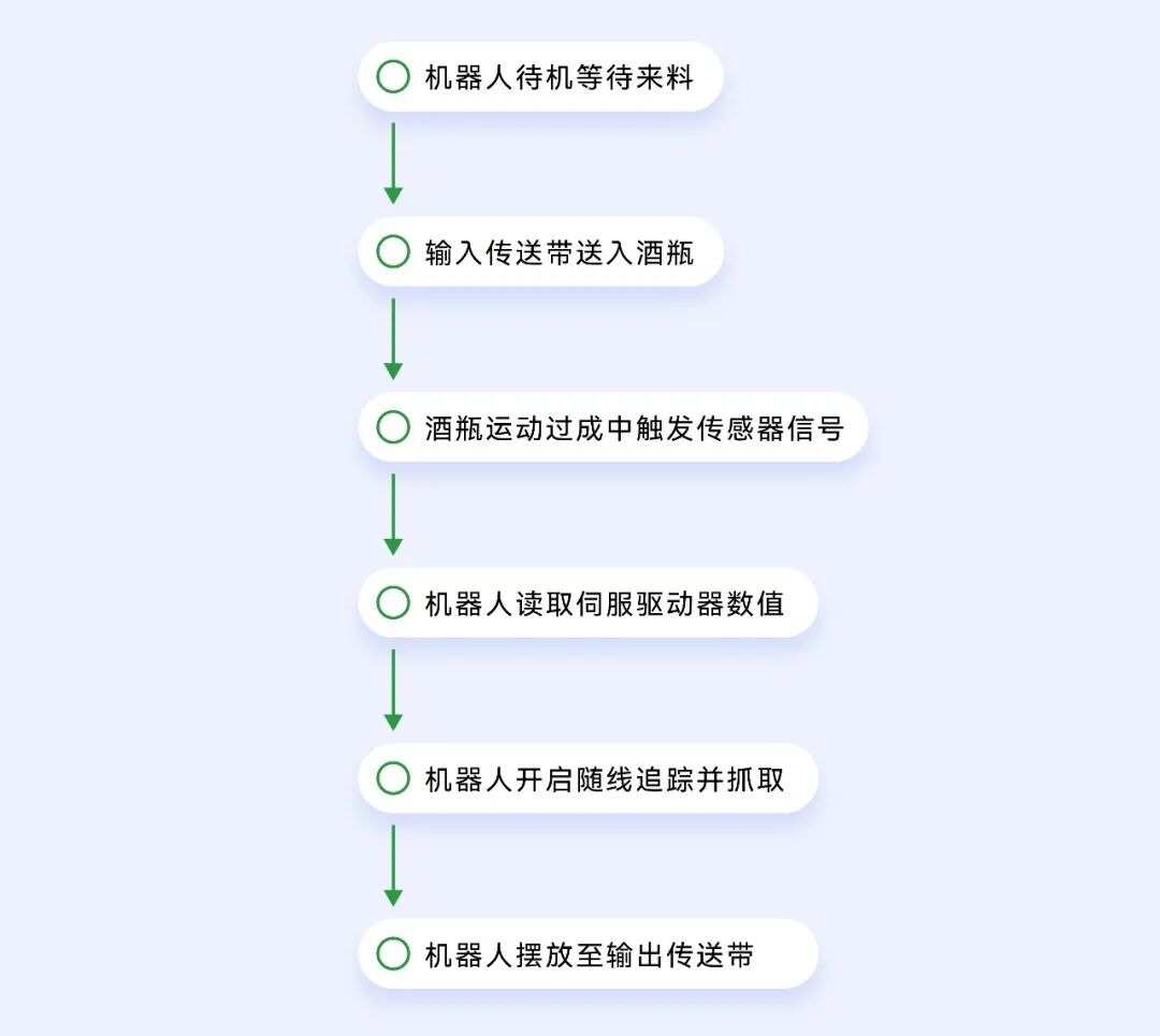 生产环节中酒瓶大小高度不一致。随生产需求SCARA机器人接收PLC信号,机器人从而做出工艺调整。对不同大小/高度的酒瓶进行抓取/摆放。