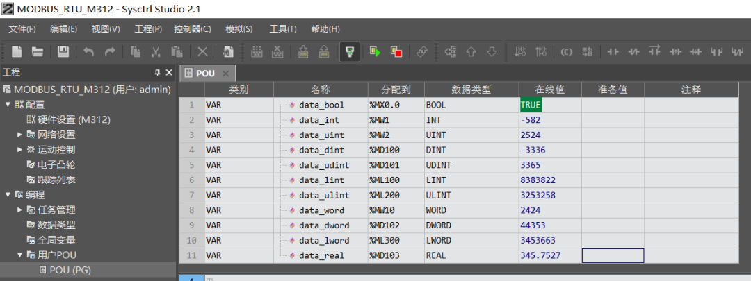 双击打开软件Sysctrl Studio,新建工程。在默认POU中,新建变量并分配到对应地址。