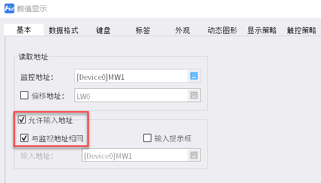(3)勾选【允许输入地址】,表示可以通过触摸屏界面直接给元件赋值。输入地址设置与监控地址相同,这里勾选【与监控地址相同】。