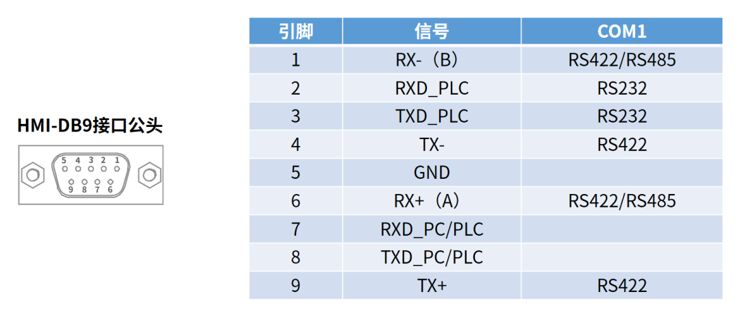 触摸屏COM1接口DB9公头引脚定义如下表。