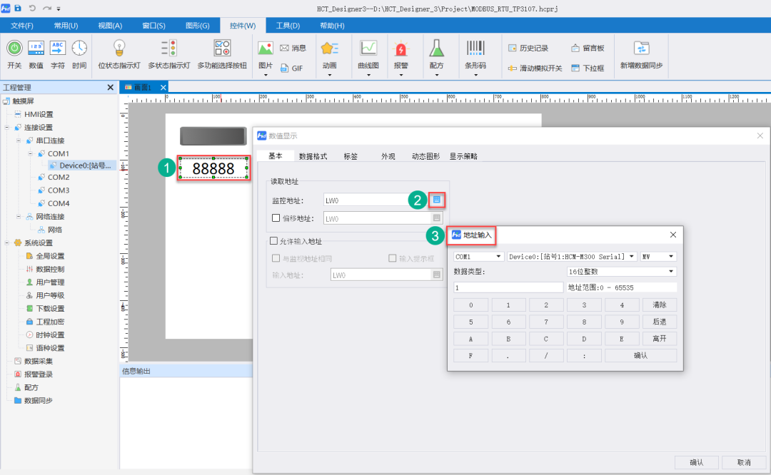 (2)新建数值元件。点击数值输入元件 ,点击监控地址右边的按钮。【地址输入】弹窗中,选择【COM1】,根据Sysctrl工程设置,地址区域选择MW,下方填入1,数据类型选择16位整数。