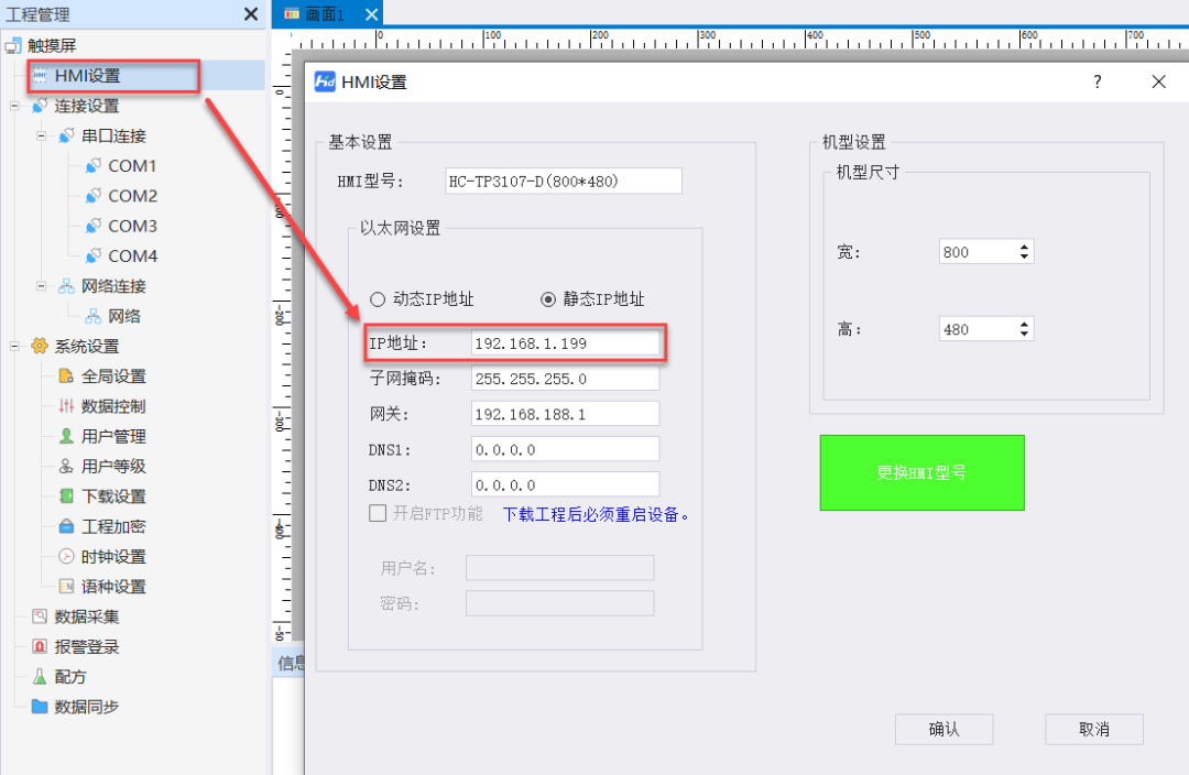 (2)点击【HMI设置】,修改触摸屏IP地址,保证触摸屏IP与控制器IP处于同一网段。