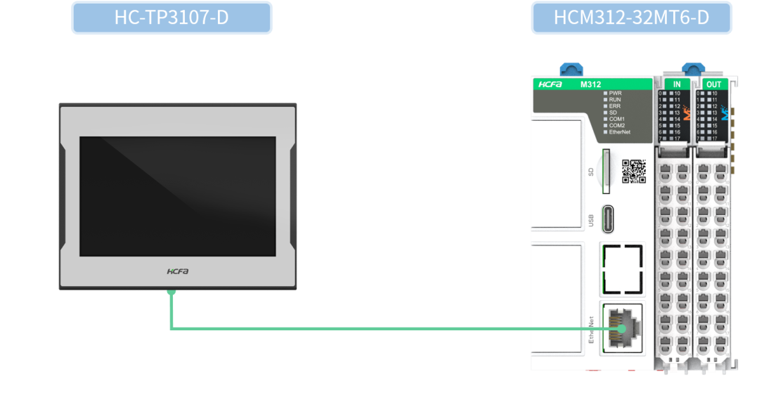 本次教程使用的是M控制器HCM312-32MT6-D和触摸屏HC-TP3107-D,Modbus TCP通信连接方式如下图。