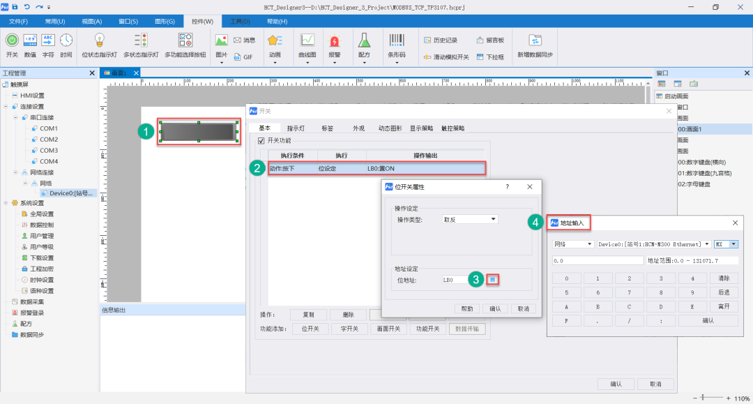 (1)新建开关元件,进行地址绑定。点击开关元件,选择序号2的红框。位开关属性界面中,【操作类型】选择取反,点击位地址右边的按钮。地址输入弹窗中,选择【COM1】,根据Sysctrl工程设置的地址,这里选择MX,填入0.0。