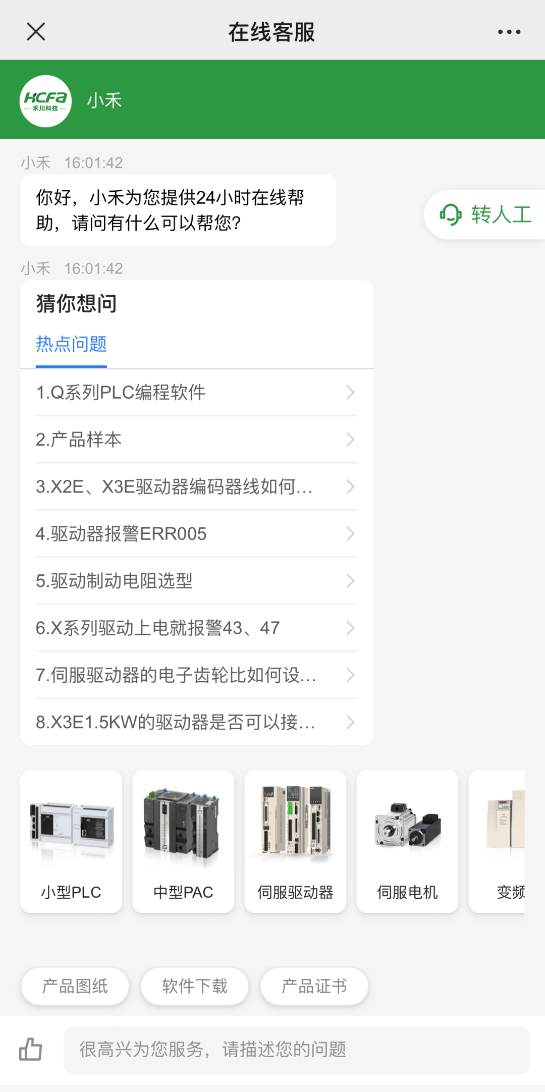 您可以在禾川自动化中心ATC公众号的菜单栏中,点击【川禾学院-在线客服】进入新的在线客服系统。