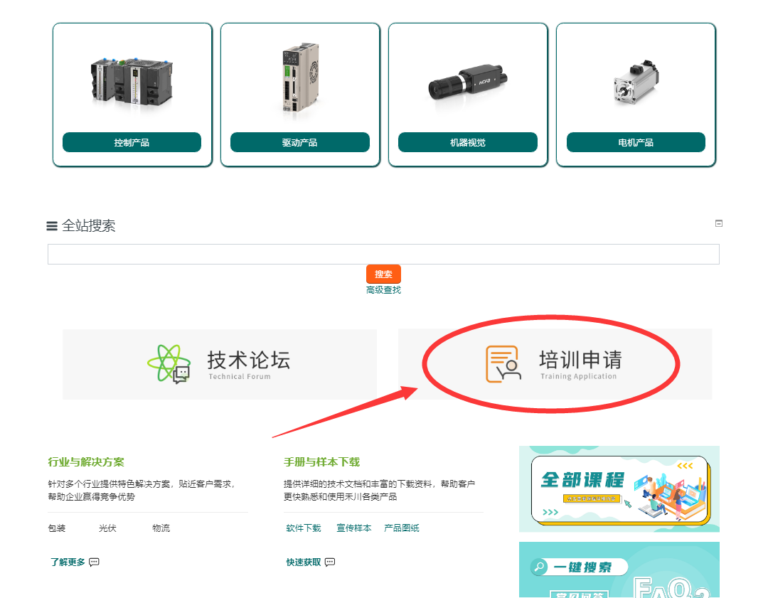 进入川禾自动化学院官网后下拉,找到“培训申请”入口并点击进入;