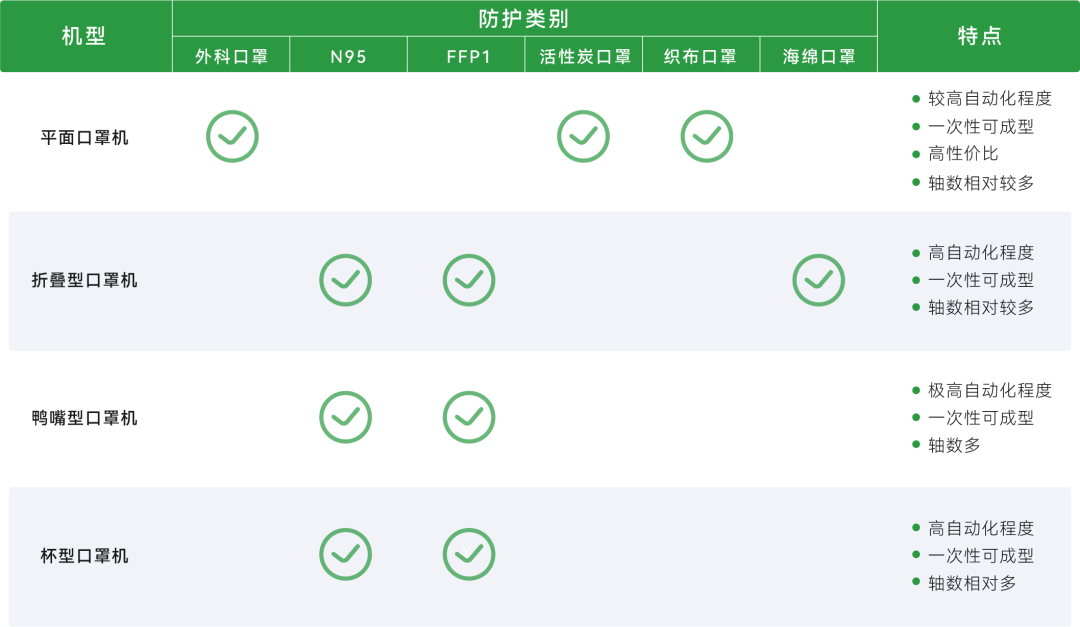 当前市场上的口罩生产设备主要分为:平面口罩机、折叠型口罩机、鸭嘴形口罩机和杯型口罩机,其中N95折叠口罩机是目前生产N95口罩最常见的机种。