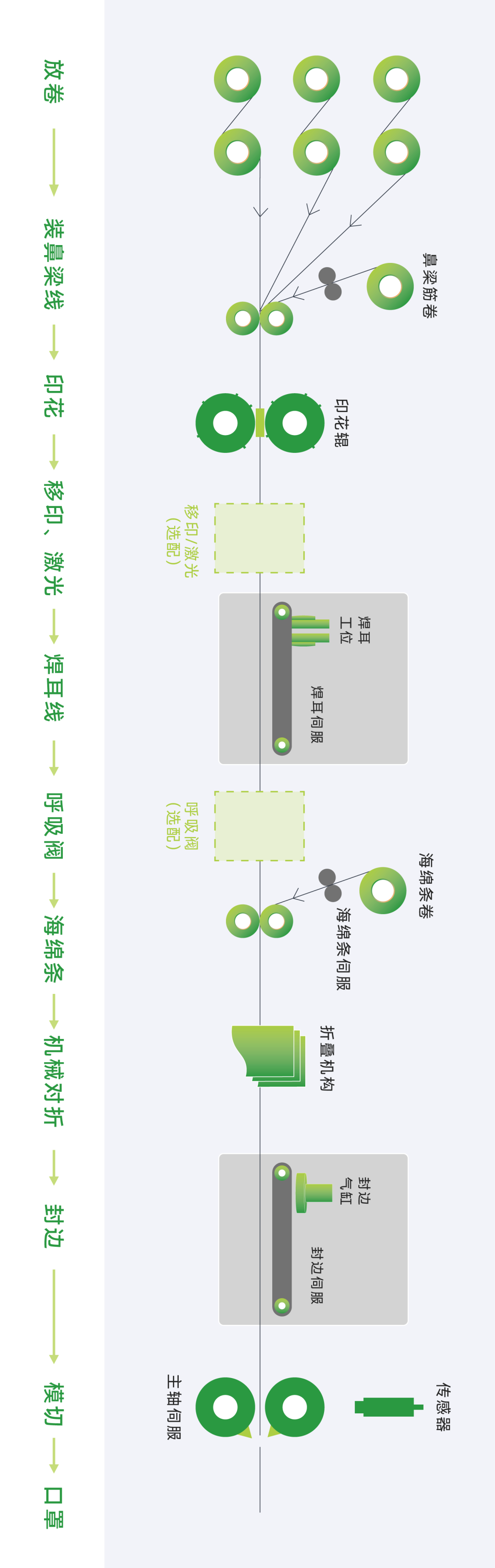 放卷→装鼻梁线→印花→移印、激光→焊耳线→装呼吸阀→装海绵条→机械对折→封边→模切→成品口罩