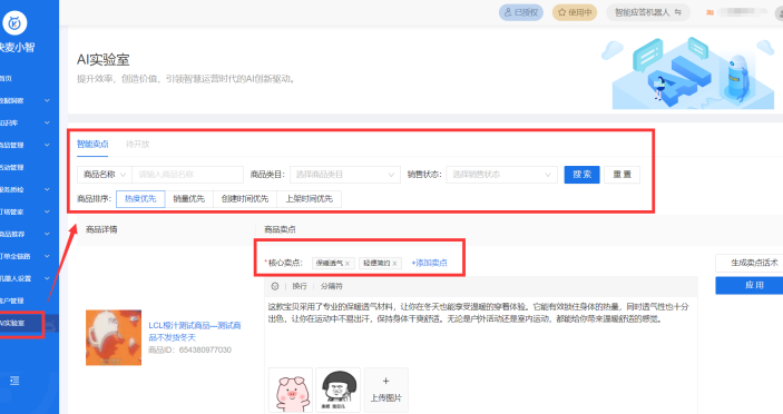 在双11预热期,快麦小智结合多年大促运营经验,首次推出了双11大促行业包功能,针对不同阶段配置不同话术,开启后可优先识别回复用户,同时还可在大促包内做好店铺规则介绍,预设生效时间,实现自动接待效果最大化,提升客服应答效率。此外快麦小智结合大模型推出“AI实验室”功能,可根据商品核心卖点自动生成卖点话术,运营一键应用,轻松备战大促,生成的智能话术也支持手动修改,保证话术的准确性及可用性。根据快麦小智服务的某服装商家反馈,仅“AI实验室”功能,就为商家运营提效20%。