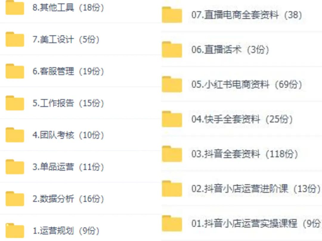 另外我们准备了300+份电商资料,涵盖直播电商和传统电商,为商家解决运营规划、数据分析、团队管理等难题。资料内容如下: