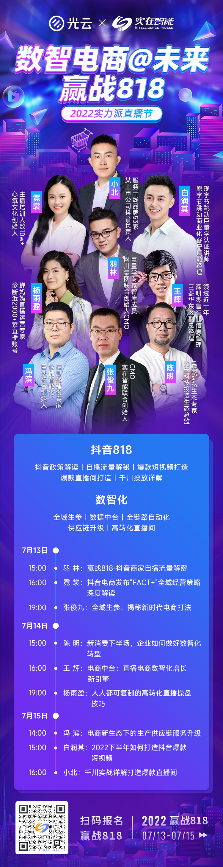 2022年7月13日-7月15日,实在智能联合派代、网川教育、老高电商圈子举办“数智电商@未来——赢战818”为主题的2022年实力派直播节。本场直播节共邀请九位电商大咖,围绕“818抖音运营专场”、“数智化最佳实践专场”两大内容话题,进行专业有料的分享。