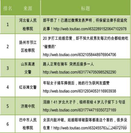 全国政法系统头条号热门文章阅读量TOP10(2016年8月)