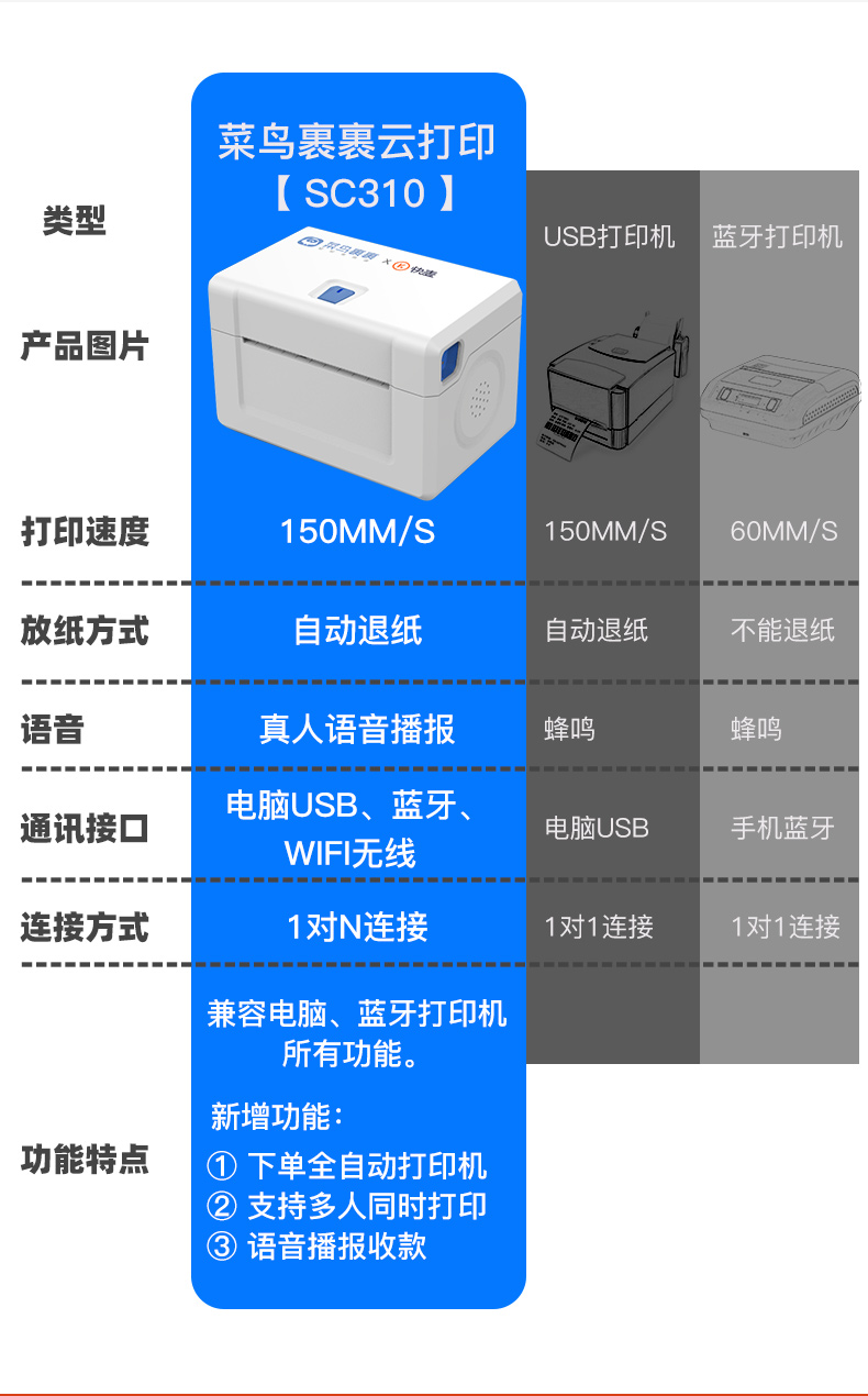 传统的面单打印机不论是usb打印机、还是蓝牙打印机,所有的订单都需要人工操作机器去打印。SC310不同与传统的面单打印机,它通过菜鸟自主开发的云服务,用户下单后通过菜鸟云可将打印指令下发给打印机,实现自动打印,无需人工操作。且遇到多个用户同时下单时,在云端排队打印不受影响。