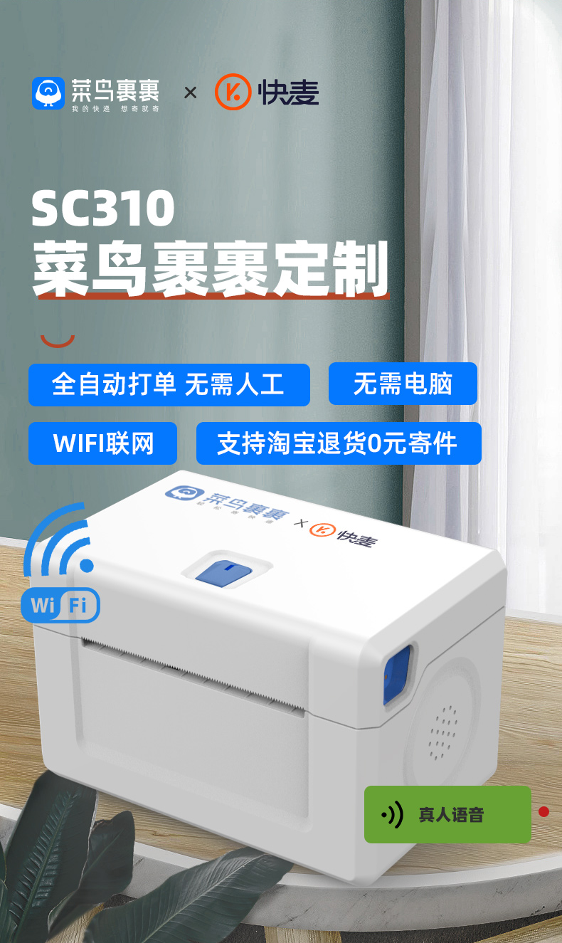SC310是快麦打印机专为菜鸟定制的云打印机,它是集WIFI+USB+蓝牙为一体的云打印机。它采用了菜鸟的最新研发的云服务,机器内置WIFI模组,连接好驿站的WIFI即可使用。用户下单时,扫码填写信息即可打印订单,真正实现了共享打印。