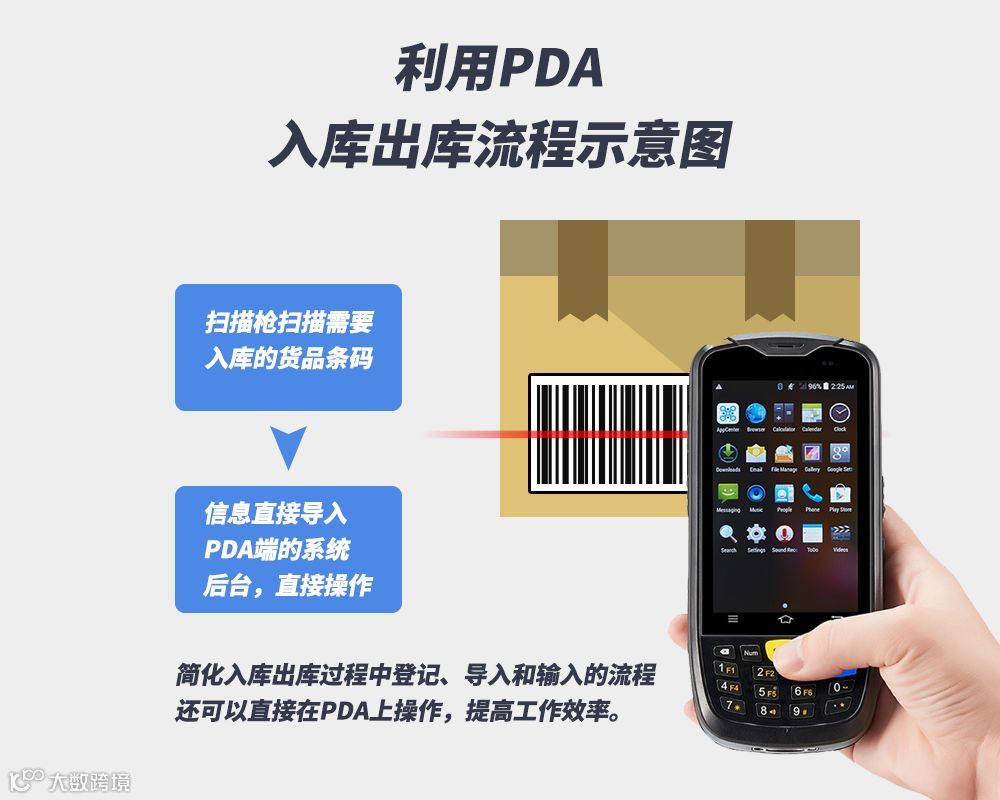 PDA(Personal Digital Assistant),又称为掌上电脑。主要通过扫描条码,读取条码涵盖的产品信息后,利用数据线或者无线的方式传输到电脑或者别的设备。