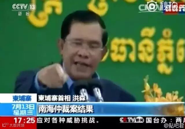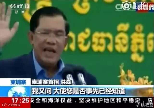 "一个多月以前,某国驻柬埔寨大使来我家拜见我,希望柬埔寨能在仲裁案结果宣布后,表态支持东盟一个声音。我立即问一个声音是什么意思。该大使回答说,支持国际法庭的判决。我又问,大使您是否事先已经知道南海仲裁案结果,中国将输,菲律宾将赢。这不是法律,这是政治事件。我不支持。"