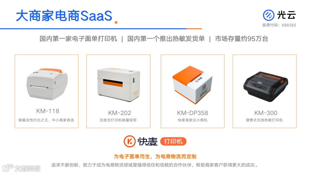 快麦打印机是光云科技旗下硬件产品,成立于2014年,专注为商家提供智能打印解决方案,是国内率先推出电子面单打印机、热敏发货单的企业。截至2021年6月底,快麦打印机已累计售出95万台。目前,快麦打印机旗下产品逐步丰富,已推出面单打印机、标签打印机、小票打印机、发票打印机、智能设备、快麦标签软件、快麦IoT解决方案等系列产品。立足杭州,面向全国,不断拓展海外市场,目前快麦打印机已远销美国、加拿大、欧洲、中东、东南亚等全球多个国家和地区。
