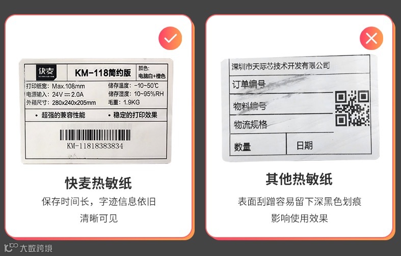 条码/面单打印机的打印方式多为直接热敏,通过打印头加热的方式进行打印。这就要求纸张类型必须为专业的热敏纸。