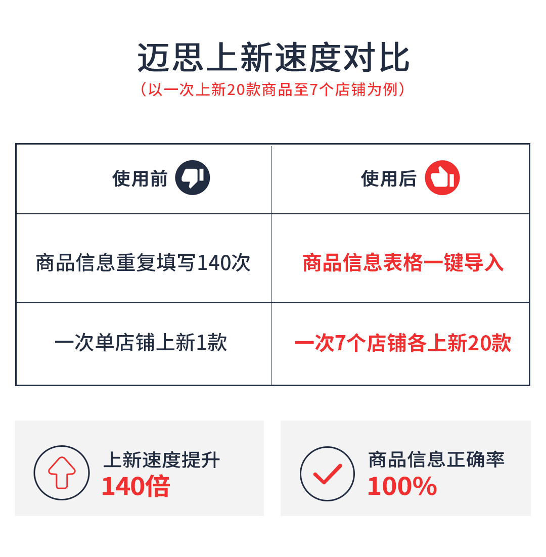 使用快麦详情机器人之后,商品上新信息可以不限款数一键表格导入。软件支持一次批量上新20款,同时可以将同款商品复制到其他店铺,避免重复劳动。至少为迈思单个店铺提高人效20倍,人效提升与店铺数量成倍数增长,同时保证信息录入无误。