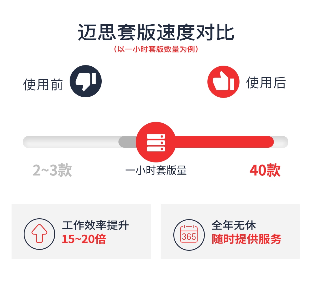 迈思的运营模式中,上新和测款都非常频繁。人工套版一款详情页至少需要二三十分钟,所以工作量十分庞大。而快麦详情机器人可以做到半小时制作20款详情页,工作效率是人工的15~20倍。并且全年无休,随时提供服务。