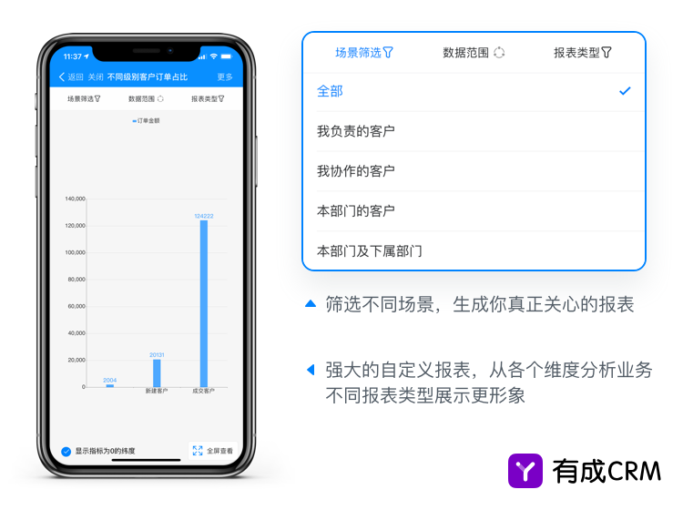 有成CRM的自定义报表,只要系统里有的字段,都可以自由配置,生成你的专属报表。不论你要看客户来源,看销售情况,还是想看某段时间内的销售的成交比例,有成crm都可以满足你!