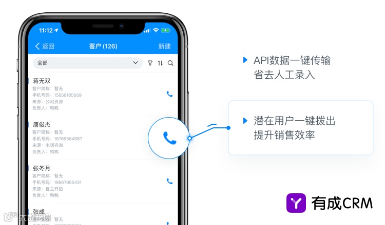有成crm API接口限时免费开放,对接知嘛家线上平台系统,原始数据一键同步,每日更新新客户,再也无须手动录入。同时有成的智能电话系统,在客户列表首页即可拨出客户电话,拨完立即填写跟进记录,工作效率提升N倍!
