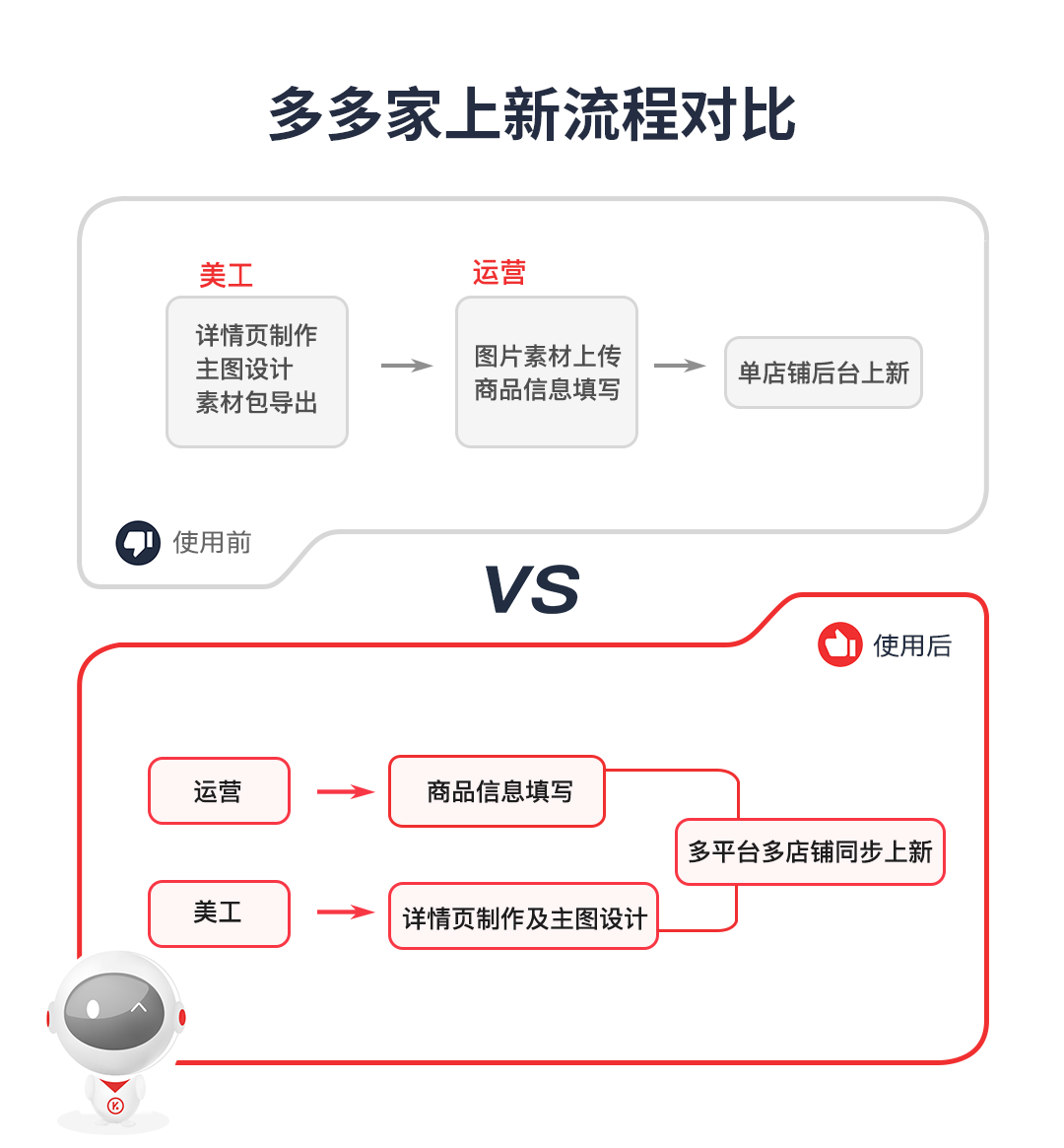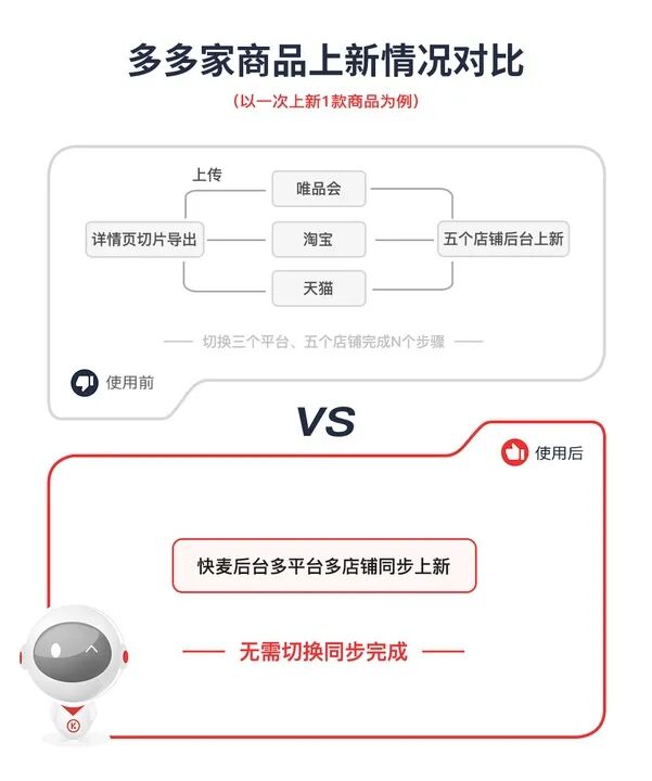 使用快麦详情机器人之后,多多家商品上新过程中的机械化工作被彻底解决。通过多平台上新功能,快速完成多平台多店铺商品上新。减少成本投入的同时优化了美工与运营的工作对接流程,实现工作方式智能化。