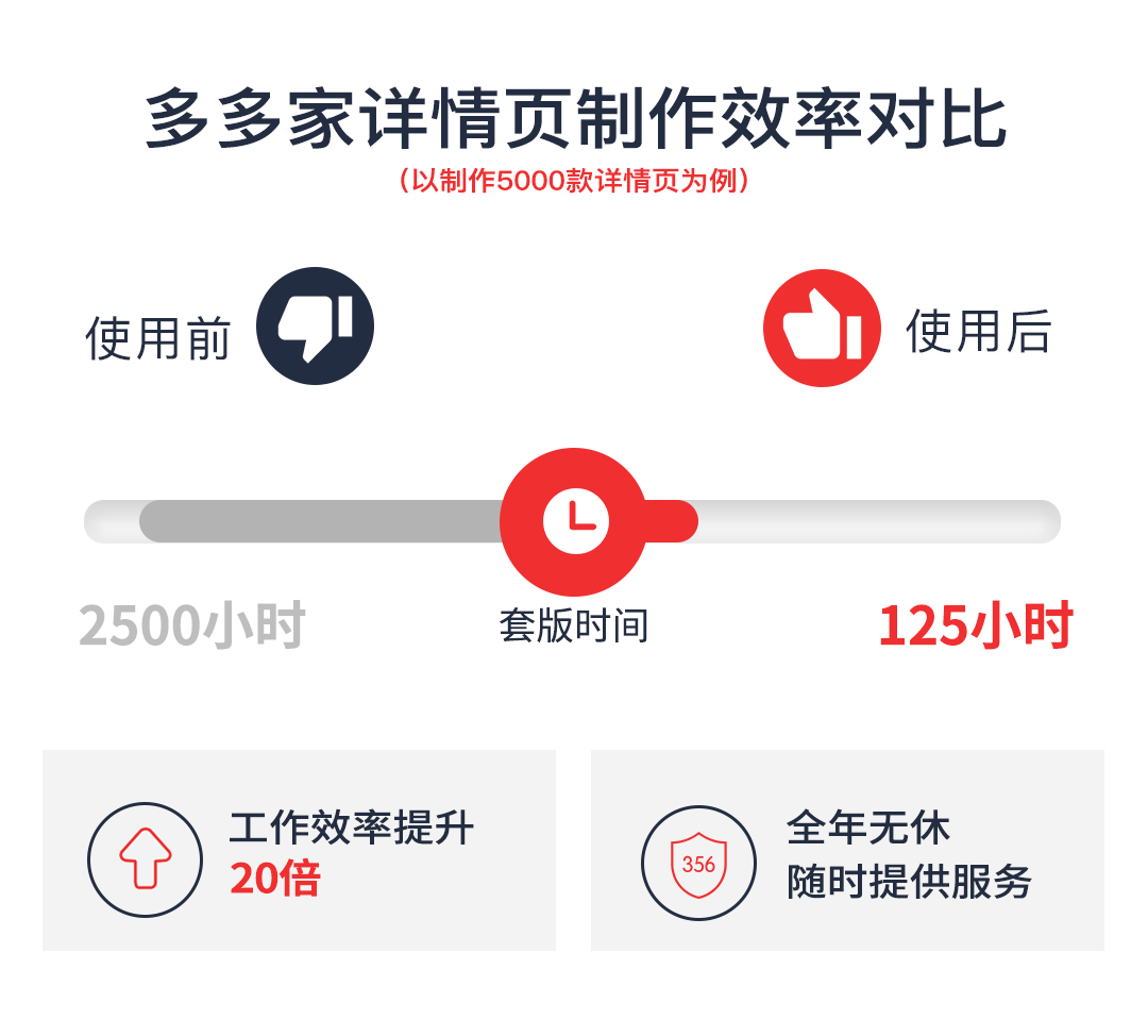 多多家年上新量超过1000款,至少需要制作5000个详情页。通常人工制作一款详情页至少需要半小时,那么制作5000款详情页需要2500小时。而快麦详情机器人支持半小时批量制作20款详情页,制作5000款详情页仅需125个小时,工作效率提升20倍。并且软件全年无休,可以随时提供服务。