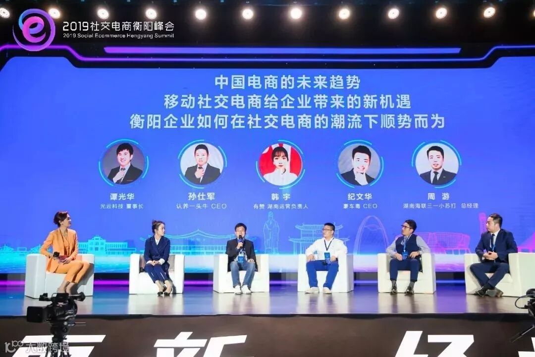 光云科技董事长谭光华、认养一头牛CEO孙仕军、有赞湖南运营负责人韩宇、豪车毒CEO纪文华、衡阳企业代表湖南海联三一总经理周游,围绕中国电商的未来趋势、移动社交电商给企业带来的新机遇、衡阳企业如何在社交电商的潮流下顺势三个主题,发表了自己的真知灼见。