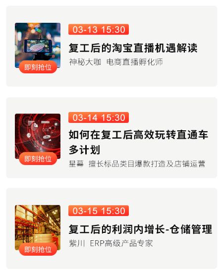 快麦联合牛气携手6位一线实战专家为商家复工复产专属定制了这次以「复工反击战」为主题的系列直播,针对复工后,电商卖家们面临的主要店铺运营难题。从3月9日开始,每天下午15点30分,不间断输出7场精品直播,分别围绕团队管理、视觉营销、爆款打造、直通车推广、淘宝直播、仓储管理等6大板块,多维度助你突出重围,在复工后的第一仗中,打出一场漂亮的反击战。