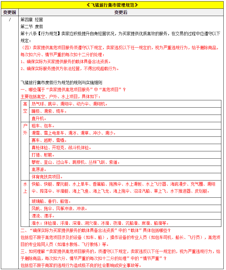 为持续提升消费者购物体验,维护市场秩序,飞猪拟修订《飞猪旅行集市管理规范》,调整度假管理规定,新增卖家提供高危项目服务的行为规范。