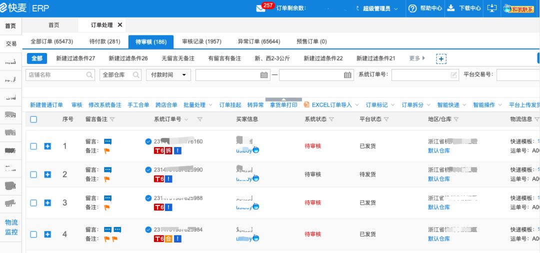 当我们从各大购物网站(淘宝、天猫、京东、当当、苏宁易购等)下单成功时,我们的订单就将被下载到ERP里进行排队处理,这里以快麦ERP举例: