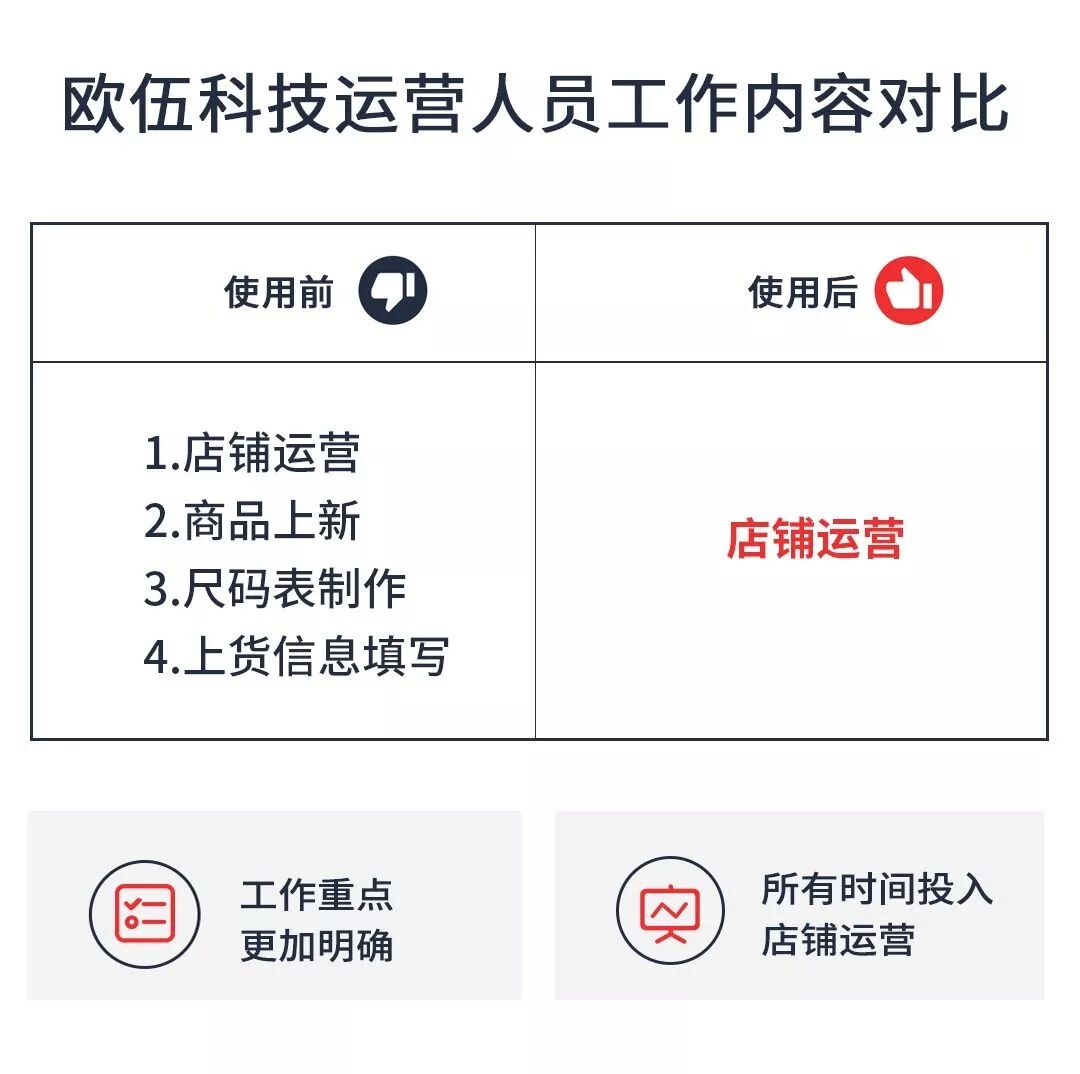 欧伍科技原先在详情页制作和商品上新中的分工是:设计师负责详情页制作;运营负责尺码表制作、上货信息填写、店铺后台上新。参与的人员也比较多,工作流程相对繁琐,极易出错。