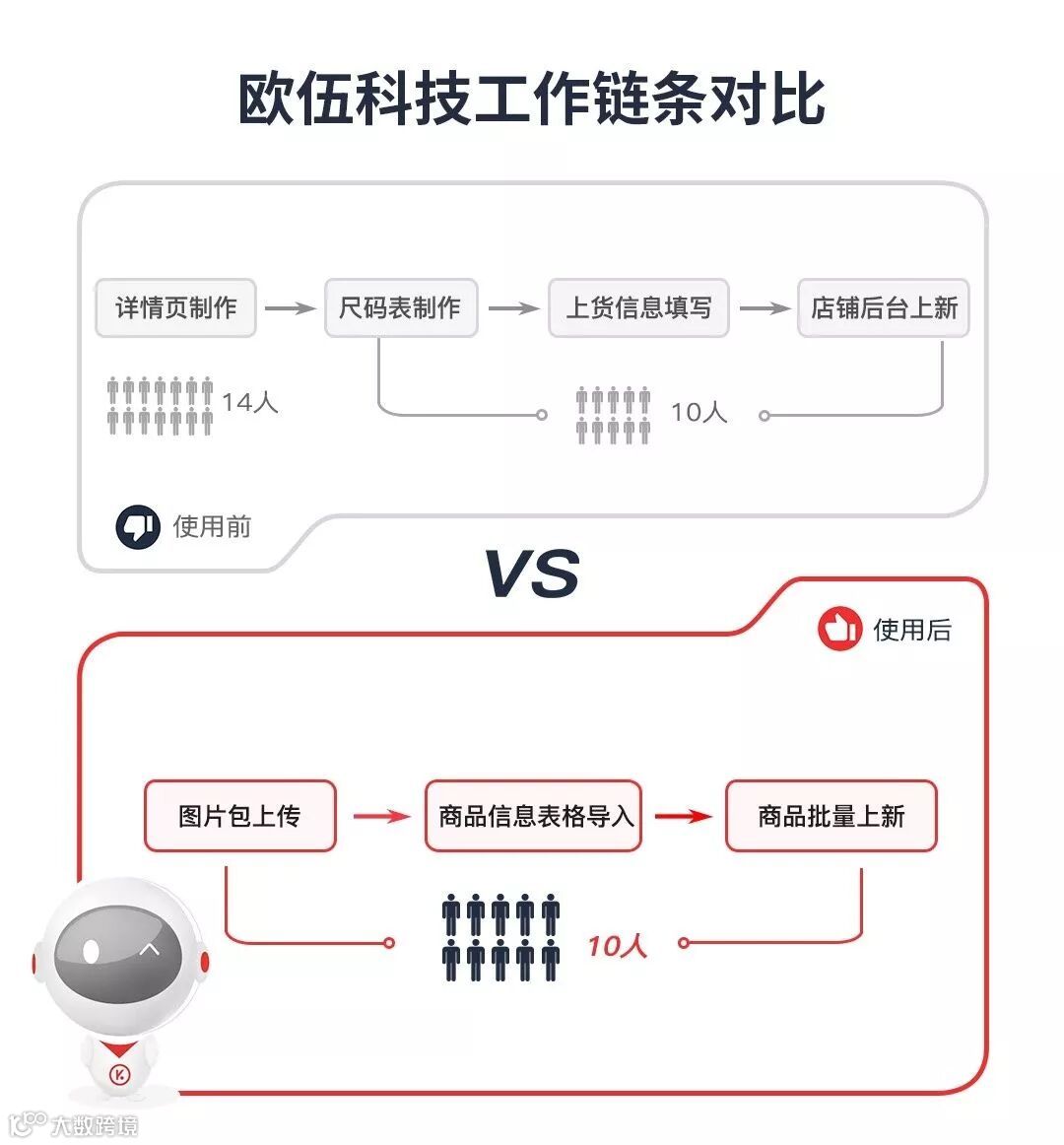 跟快麦详情机器人合作之前,欧伍科技是通过人工完成详情页制作和商品上新的。一款商品从图片到可以在电商平台出售至少需要半小时,并且欧伍科技服务的品牌与日俱增,所以工作量也是随之增长。