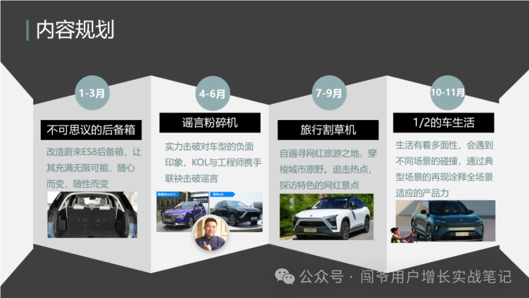 蔚来汽车为达成相关目标制定了核心策略,通过全年分阶段打造产品力话题事件,保证每个季度均有活动、每个月都有话题,促使品牌热度不断攀升。