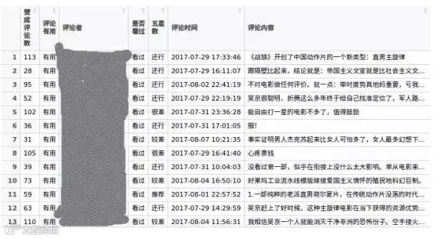 爬取的内容主要是:用户名,是否看过,评论的星星点数,评论时间,认为有用的人数,评论内容。参看下图(用户名已隐藏):