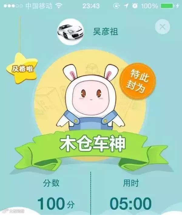 恭喜您通过驾驶员考试,荣获木仓车神!